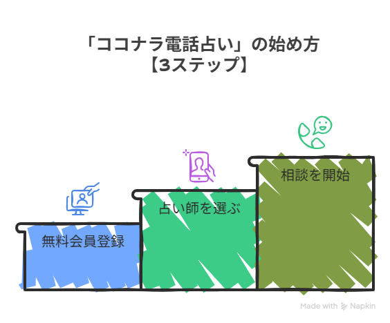 この記事ではココナラ電話占いの使い方を、登録から相談まで3ステップでわかりやすく解説します。
